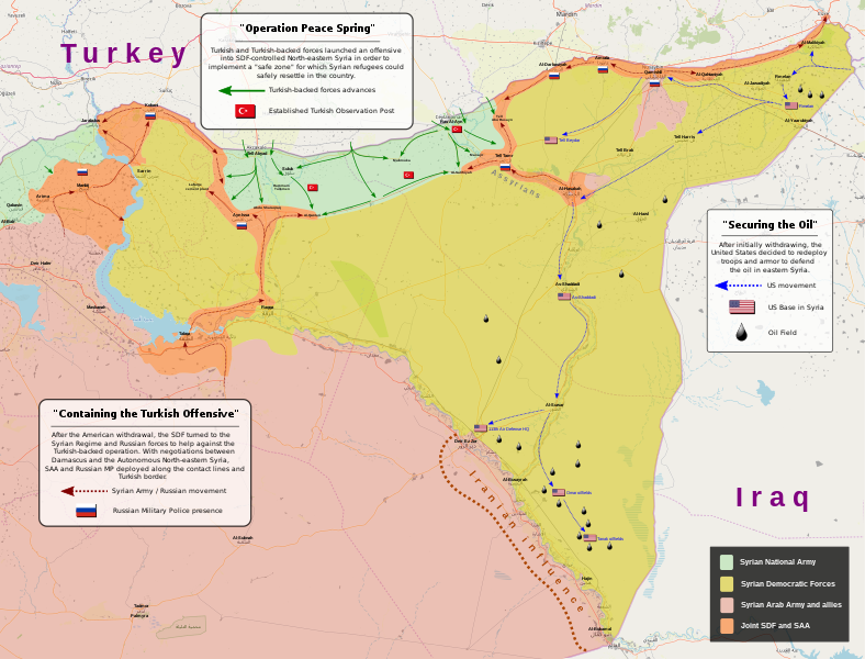 Throughout 2019 Ankara had been in talks with Washington regarding the creation of a new “safe-zone” in Northern Syria, the familiar rationale “counterterrorism and refugee settlement” was given, but Trump’s administration appeared to be holding back Turkish encroachment. This was the situation when American troops were suddenly ordered to withdraw from Rojava. Effectively, the United States gave its blessing to a Turkish invasion, which is exactly what happened. “Operation Peace Spring” was a rapid movement of Turkish forces across the Syrian border. In ten days a strip of land 120km wide and 30km deep was claimed, controlling the key towns of Tel Abyad and Ras Al-Ayn.
